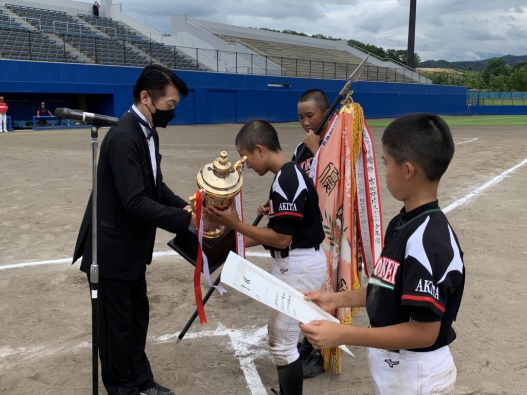 表彰式では横手かまくらライオンズクラブ会長 L大日向(withタキシード)より、優勝チームへトロフィーを授与。